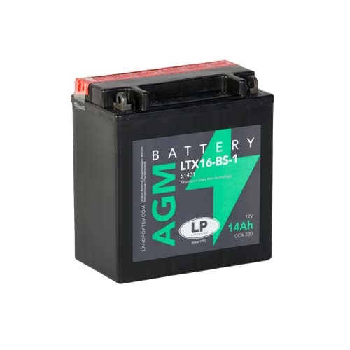 - Akumulator motora LTX16-BS-1, 12 volti, 14 Ah, starter je akumulator s AGM tehnologijom. LTX16-BS-1 je suhi prethodno napunjen i dolazi s odgovarajućim paketom kiselina. Ova olovna baterija je, nakon punjenja i punjenja, 100% bez održavanja i nepropusna. Može se ugraditi u nagnuti položaj do 45°. LTX16-BS-1 je pravi allrounder i pogodan za sezonsku upotrebu i kratke udaljenosti.