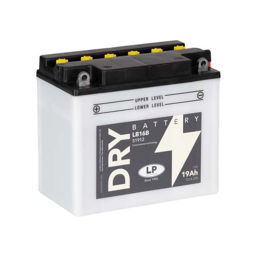 - Akumulator motocikla LB16B, 12 volti, 19 Ah, konvencionalna je baterija za pokretanje koja pruža pouzdanu startnu snagu po izvrsnoj cijeni. LB16B starter baterija je suha prethodno napunjena i dolazi s odvojenim paketom kiselina i može se instalirati samo u uspravnom položaju. Ova olovno-kiselinska baterija LB16B prikladna je za gotovo svako vozilo s osnovnim potrebama za napajanjem.